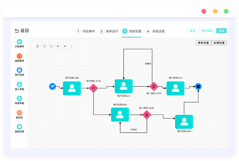 提供可视化工单流程定义面板、丰富的可视化控件和功能强大的表单设计器,支持表单模板、动态表单、VIP管理、SLA等高级功能,能够满足复杂场景下工单流程配置的要求